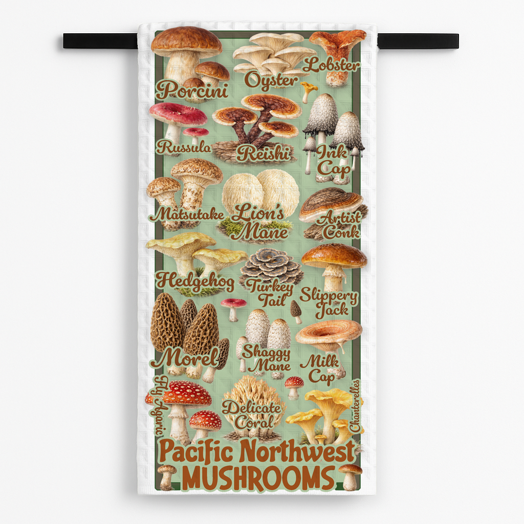 Bring a dose of personality to your kitchen with the Pacific Northwest Mushrooms Tea Towel! This towel is more than just functional—it's a conversation starter.